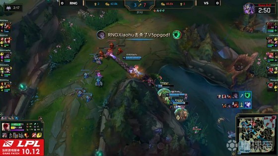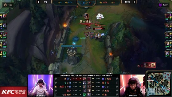 前期节奏平稳,除去V5下路压线过猛被绕后gank送出一血外,没有太多人头产生。8分钟双方先锋河道交火,New脱节被秒导致RNG小亏,weiwei拿下峡谷先锋,野区资源控制进度V5开始占据上风。