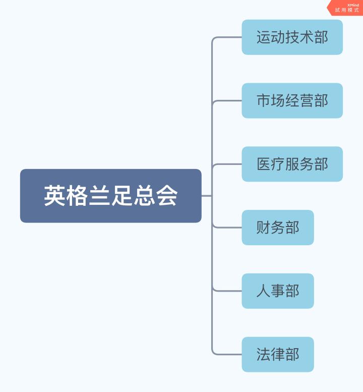 英格兰足总的机构设置十分精干,设有运动技术部、市场经营部、医疗服务部、财务部、人事部和法律部,专职人员仅有32人,大量的工作主要依靠志愿者。
