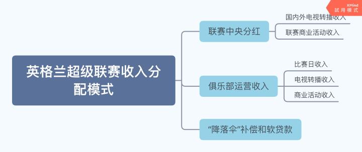 英格兰超级联赛的收入分配模式由联赛中央分红和俱乐部运营收入两部分构成,英足总作为监督机构并不参与英超联赛的任何分红。