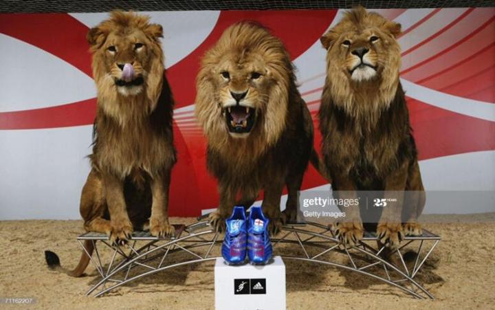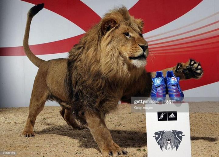 小贝的猎鹰8代的第二款配色发布于2006年世界杯前的5月,由于这款鞋将是贝克汉姆世界杯的战靴,而贝克汉姆是三狮军团英格兰队的队长。所以adidas公司可以说是花了极大精力来营销,首发广告居然还找来了马戏团的驯兽员和三只狮子来参与拍摄。这些狮子果然是训练有数,没一口把鞋子给啃了。这款鞋的鞋底图案是三个狮头,由于是蓝色主色调,被国内玩家称为蓝狮。