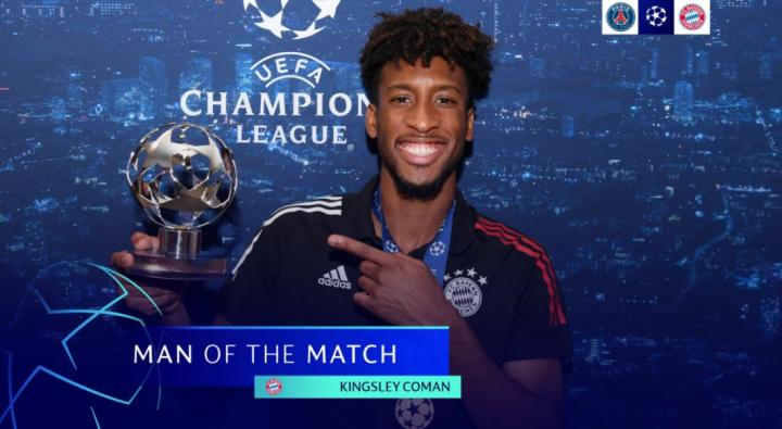 凭借攻入制胜球的优异表现,拜仁边锋科曼当选2019-20赛季欧冠决赛全场最佳球员。