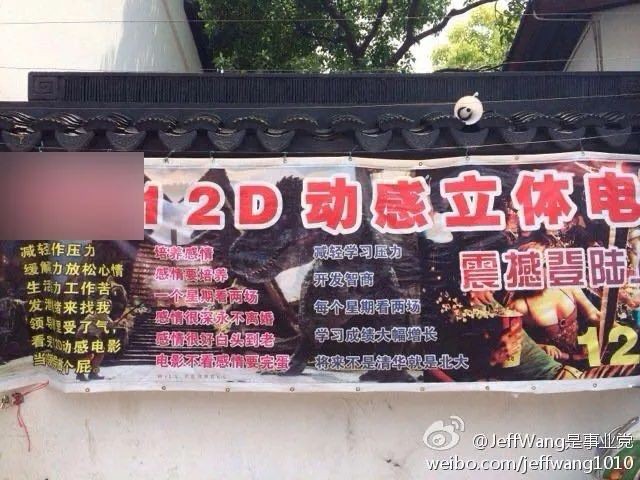 宣传幅上印有醒目标语:“每个星期看两场,学习大幅增长!”