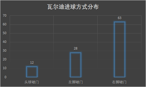作为一名左右脚全能的英格兰前锋,瓦尔迪之所以可以在素来强调身体对抗的英超联赛中占得一席之地,便是因为他在多年的磨练后形成了一套堪称鬼魅的跑位体系。与此同时,瓦尔迪均衡的左右脚能力也让他能够从容把握一些转瞬即逝的机会。如上图所示,在瓦尔迪的103粒英超进球中,他一共完成了12次头球破门、28次左脚破门、63次右脚破门(包含18粒点球)。