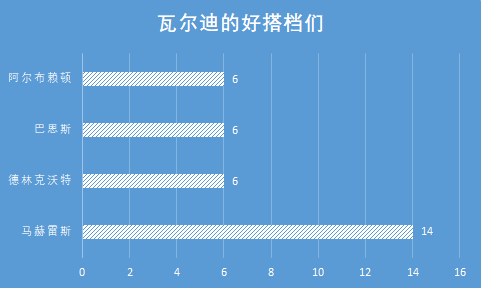 在瓦尔迪已经打入的103粒英超进球中,为他献上助攻数最多的是来自阿尔及利亚的边锋马赫雷斯,这位现曼城球星在效力莱斯特城期间一共为瓦尔迪送上了14次助攻。在马赫雷斯身后的是丹尼·德林克沃特,这位英格兰中场在效力莱斯特城期间一共为瓦尔迪送上了6次助攻。除了马赫雷斯和德林克沃特,今年只有22岁的哈维·巴恩斯以及英格兰老将阿尔布赖顿也是瓦尔迪的坚实搭档,他们分别为这位英格兰国脚送上了6次助攻。