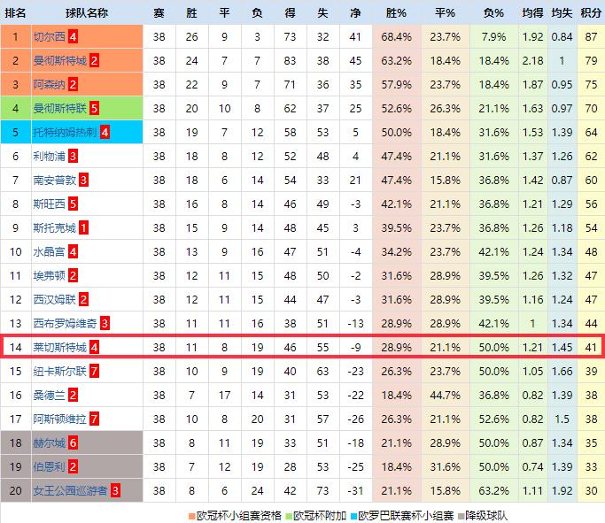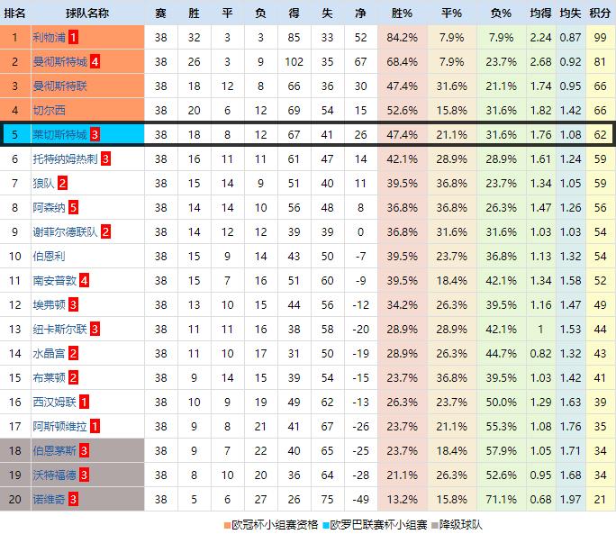 完成神奇夺冠的壮举后,莱斯特城的冠军阵容受到了一定程度的冲击,坎特、马赫雷斯等一批明星球员纷纷转投他队,而类似于摩根这样的功勋老将又因为年龄增长出现了状态下滑的情况。在这样的背景环境之下,狐狸城在接下来的几个赛季都没有能够展现出类似于以往的风采。直到本赛季,莱斯特城在北爱尔兰名帅罗杰斯的调教下重新焕发光彩,他们在很长一段时间都霸占着联赛第二的宝座。即便近期战绩不佳,莱斯特城在本赛季英超联赛结束后依旧可以以18胜8平12负积62分的成绩排名第5,顺利获得下赛季欧联杯参赛资格。