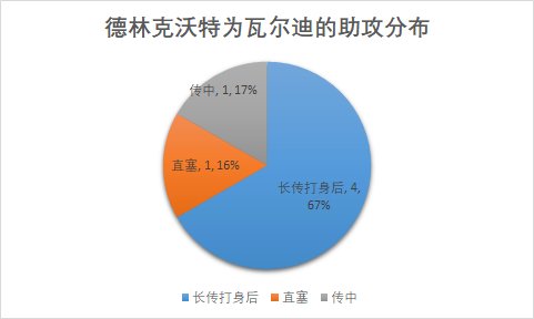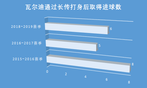 在2015~2016赛季、2016~2017赛季、以及2018~2019赛季,瓦尔迪最为常见的进球方式都来自于长传打身后。这位英格兰前锋在2015~2016赛季通过长传打身后取得了多达8个进球,占到当赛季他英超总进球数的33.3%;到了2016~2017赛季以及2018~2019赛季,瓦尔迪通过长传打身后反击形成进球的次数有所减少,分别为5次和6次。不过需要强调的是,瓦尔迪在这两个赛季通过长传打身后形成进球的次数虽然有所减少,但并不意味着莱斯特城已经开始逐渐放弃这种战术,而是因为球队在这两个赛季的纸面实力整体下滑,从而导致给瓦尔迪的火力输送质量远不如以往。在2016~2017赛季以及2018~2019赛季,瓦尔迪通过长传打身后形成的进球数分别占到他所有进球数的38.5%以及33.3%。