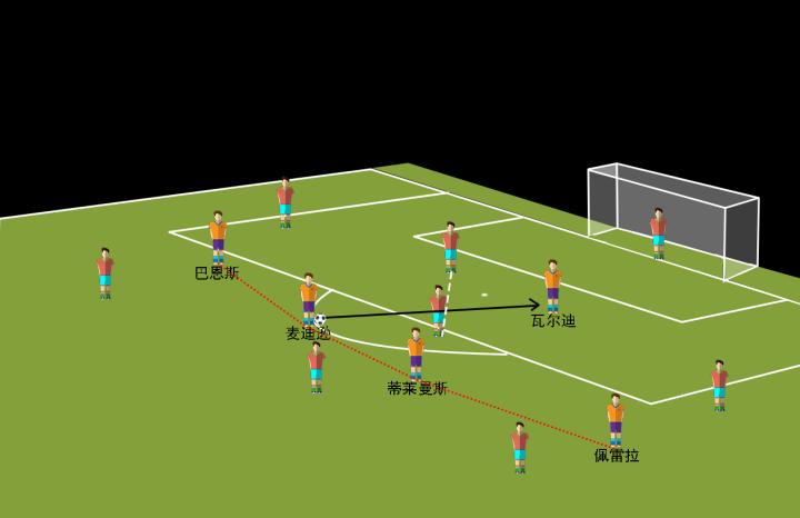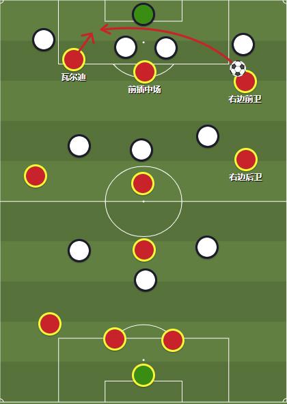 当麦迪逊、蒂莱曼斯其中之一移动到对方的某个边路时,另外一人会积极沿中路插入禁区,成为除瓦尔迪外的第二包抄人。这样一来,原本将全部注意力集中在瓦尔迪身上的中卫就不得不分心防守这位后插上中场,瓦尔迪便可以悄然离开对方的合围圈,转而游弋到防守力量较为薄弱的后点区域。