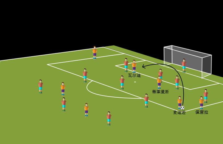 对于部分球迷来讲,后插上进球以及换位进球可能是较为陌生的术语。在进入下个环节之前,笔者有必要先根据战术板为各位球迷简单介绍这两种进球方式。