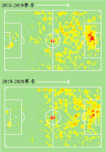 熟悉莱斯特城主力人员配置的球迷们应该已经发现:这些与瓦尔迪联系较为密切的中场球员位置较为分散,有人喜欢活跃在右路,有人喜欢活跃在左路,也有人喜欢在中路进行组织分球。由此我们可以推断:瓦尔迪在进攻过程中的要球没有明确的区域局限,他往往可以利用自身灵活的跑位游弋到皮球所在路线。这一点从瓦尔迪近几个赛季的热点图中也可以得到明显的体现,如上图所示,可以发现,瓦尔迪在场上几乎没有固定的活动区域,对方的整个半场都可以成为他的要球空间。