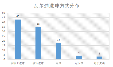 对于瓦尔迪来讲,由后向前的后插上举动在他的进攻环节中占据着非常重要的地位。截止到目前,瓦尔迪已经在英超联赛中打入了103个进球,而他的后插上进球就在其中占据了整整43个,比例达到了惊人的41.7%。除了后插上进球,瓦尔迪还有4种进球方式,分别是换位进球、点球、定位球以及对方失误。从占比来看,瓦尔迪通过换位进攻打入了35个进球、通过点球打入了18个进球、通过定位球打入了4个进球、通过对方失误打入了3个进球。