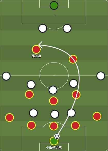 上述这种进攻方式就是我们通俗意义上讲的“直传斜塞”。不过我们在此需要强调的是,瓦尔迪在拿到皮球后既可以选择用他擅长的右脚径直推射,也可以选择一种更为稳妥的进攻方式--右脚横扫。原因非常简单,对方后防线在马赫雷斯以及瓦尔迪的直传斜塞连线后已经出现了一定程度的松散,此时无论是内收的左边锋还是后插上的中场都将获得更多的接球空间。与此同时,考虑到瓦尔迪此时已经位于小禁区内,即便他的横扫传中没有办法直接找到队友,也有可能形成禁区内的混乱。