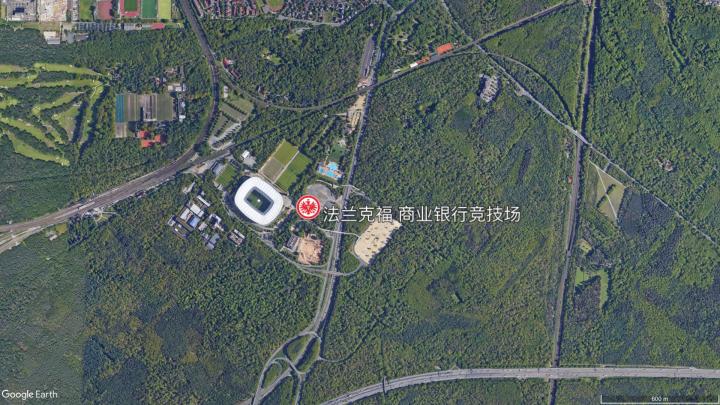 沃尔夫斯堡所在的下萨克森州向南是黑森州,州内第一大城市法兰克福也有一支德甲俱乐部。注意德国有两个法兰克福市,这里的是美茵河畔法兰克福,另一个是德国波兰边境的奥得河畔法兰克福,位于勃兰登堡州。法兰克福城沿美茵河而建,法兰克福俱乐部的主场——商业银行竞技场位于城南的郊区,附近都是林地。