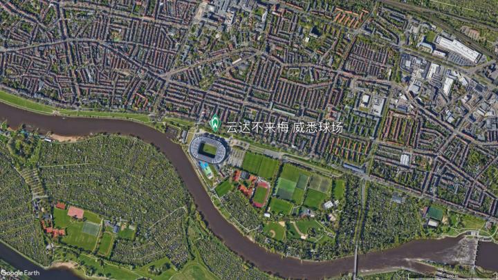 最后要讲的是德甲最北边的球队——云达不来梅,其位于不来梅州的不来梅市。不来梅是德国第二大港口城市,也是最早开展对华贸易的德国城市之一,1861年由清政府与普鲁士签订的《中德通商条约》中涉及的“汉谢城伯磊门”即是汉萨城市不来梅的古称。流向北海的威悉河贯穿不来梅城,云达不来梅的主场也因此命名为威悉球场。威悉球场位于不来梅城东南,威悉河北岸,球场旁即为训练基地。