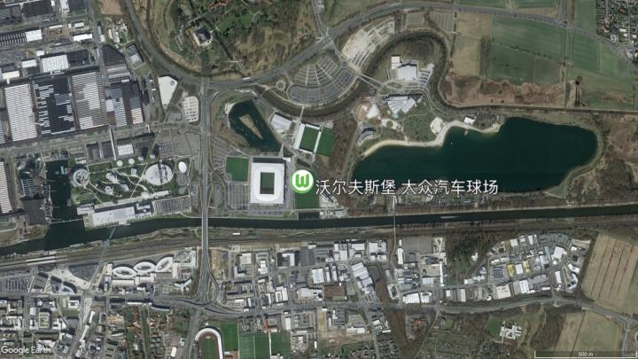 原东德领域内只有2支德甲球队,而原西德领域内,离东德最近的德甲俱乐部是沃尔夫斯堡。沃尔夫斯堡俱乐部所在的沃尔夫斯堡市位于下萨克森州最东端,人口只有十几万,但这是一座汽车城,大众汽车总部所在地,因为发达的汽车工业,沃尔夫斯堡的年人均收入位于全德前列,高达12万美元。大众汽车也是沃尔夫斯堡俱乐部主场的冠名商,球场位于德国中部运河之北、阿勒尔河之南,球场西边是大众汽车博物馆,东边是水上乐园。