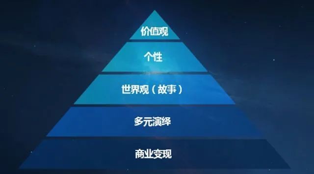 腾讯集团市场与公关部助理总经理戴斌进一步将IP细分成五个纬度,并以此构建了“IP金字塔”理论:最顶端核心的是价值观,往下分别是个性、世界观(故事)、多元演绎以及商业变现。五周年到来之际,从国民级游戏转变为国民级IP的王者荣耀,正在从上至下扎实这座“IP金字塔”。