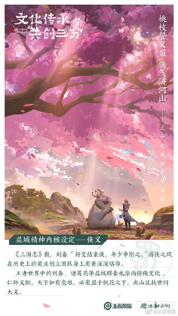 一颗枝繁叶茂的老桃树,成为了蜀国精神内核“侠义”的体现。这不禁让人联想到,在三国这段特殊的时期,刘关张三人宣誓同生共死的那片桃园。而在王者三分之地中,老桃树同样见证了蜀国英雄们的侠义精神,“天下如有危难,必聚盟于桃花之下。”