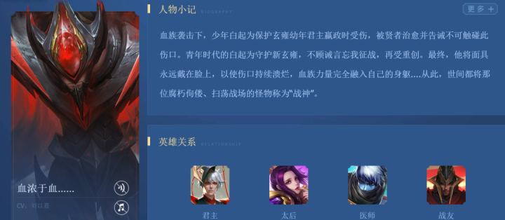 在“强者之路”版本中,研发团队重新诠释了英雄“白起”的故事:他充满理想,英勇善战,更充满牺牲精神,曾为玄雍君主受过重伤。但也因过于喜好杀戮,给他带来了诅咒与痛苦。这种矛盾感来自王者大陆中玄雍残酷的环境,玩家也能借此看到传统文化中白起的一些影子。
