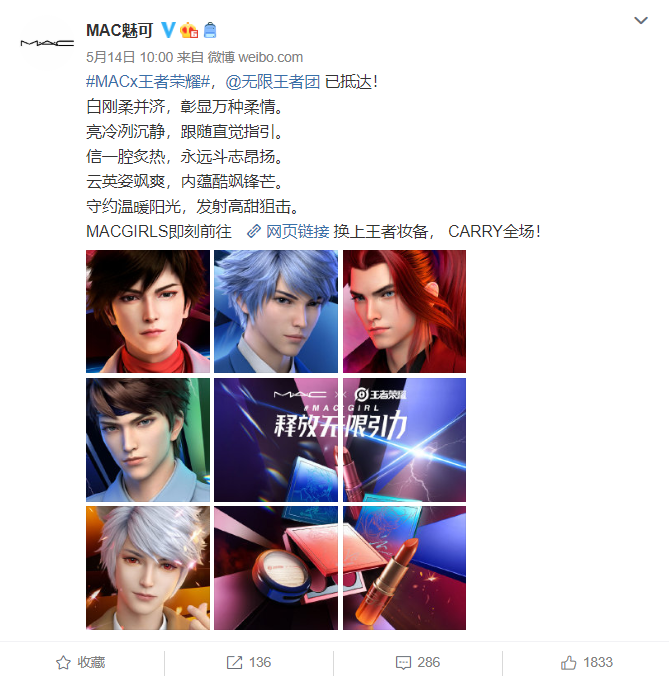 无限王者团自身独特的生态圈,也让不少品牌,尤其是时尚品牌意识到了王者荣耀IP的魅力。4月,无限王者团与MAC魅可推出了联名款美妆。MAC魅可根据男团五位成员各自的风格,设计了五款不同的彩妆产品,一经推出大受欢迎。