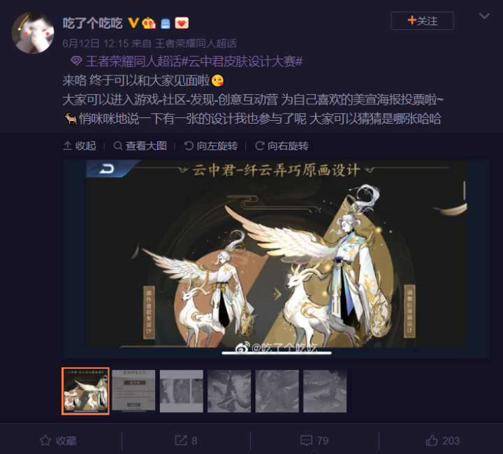设计美学博主“吃了个吃吃”又一次参赛,并在微博上放出了她的设计,收获了不少点赞。在年初举办的“云中君皮肤设计大赛”中,她的作品“纤云弄巧”最终胜出。在后续的游戏更新中,她设计的皮肤将正式在游戏中开售。