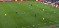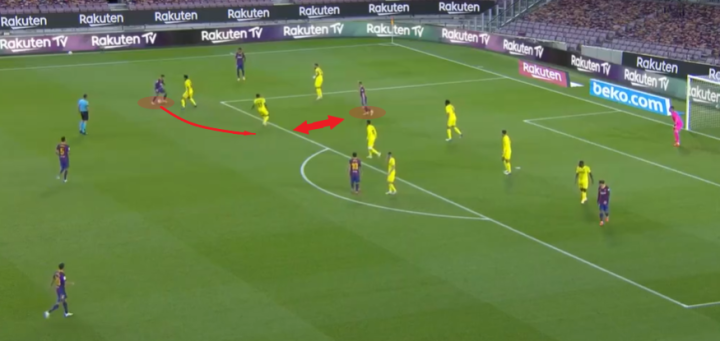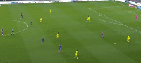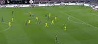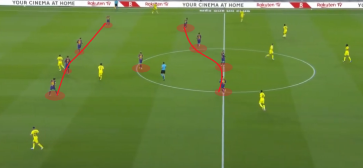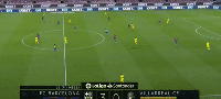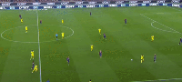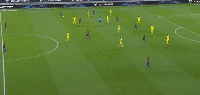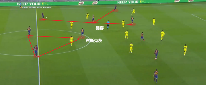 这又是法蒂沿边线突破受阻,德容赶忙来帮忙。他沿边线的推进相对成功,也顺利把球给到法蒂。随后,他就出现在法蒂的身后,协助他把球向中路转移。布斯克茨理所应当地站在中路,协调球权在两条边路之间的分配。