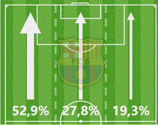 当然,德容的存在也让巴萨更有信心从这一侧发动进攻。右边路则缺乏这样的联系,布斯克茨并不会频繁移动过来和罗贝托串联。格列兹曼或梅西如果要回撤,前场就又少了一个接应点,所以罗贝托这一侧就显得沉寂一些。仅就上半场而言,巴萨超过一半的进攻都是通过球队的左路发动。