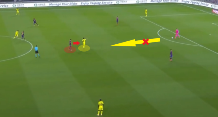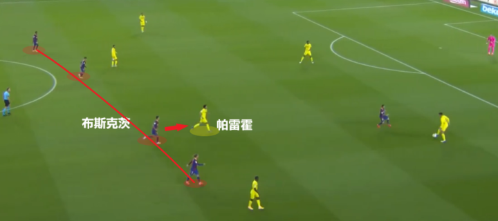 布斯克茨前顶的目标,除了干扰持球队员外,很大一个目的就是为了锁死对方的5号帕雷霍。巴萨要尽量避免他的拿球,因为他的组织调度,很有可能是致命的。