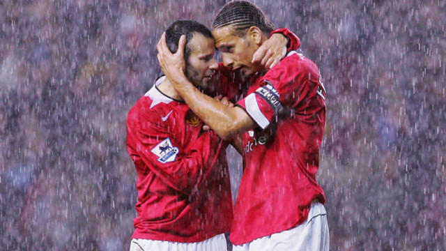 (图)终场哨响,吉格斯和费迪南德在雨中庆祝胜利