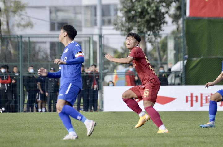 比赛第13分钟,对方右路下地传中,孙逸铲球解围。
