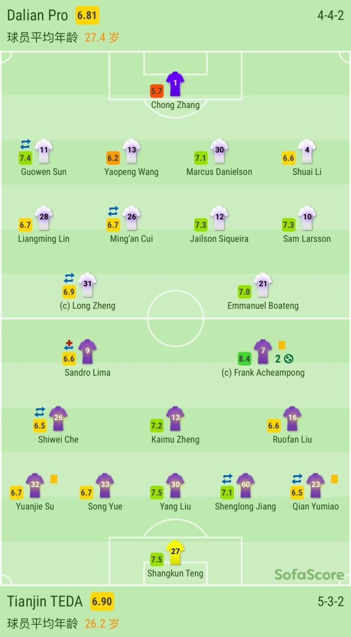 大连人方面,孙国文获得全队最高的7.4分;天津泰达方面,阿奇姆彭获得全场最高的8.4分。