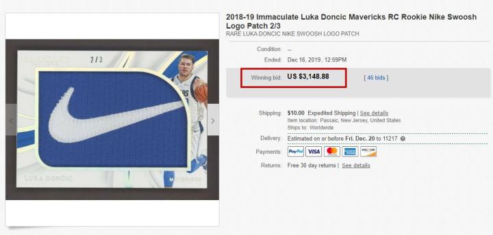 一件球衣上面只有一个品牌商标,所以这样的切割自然比较吸引人。篮球方面主要是耐克和阿迪的天下,而足球的品牌商则更多一些。个人非常喜欢品牌切割,感觉一个完整的商标切割非常漂亮。当然,商标切割也是非常火的,近期截标一个东契奇的球衣切割,而且还只是player-worn,大家可以感受一下价格: