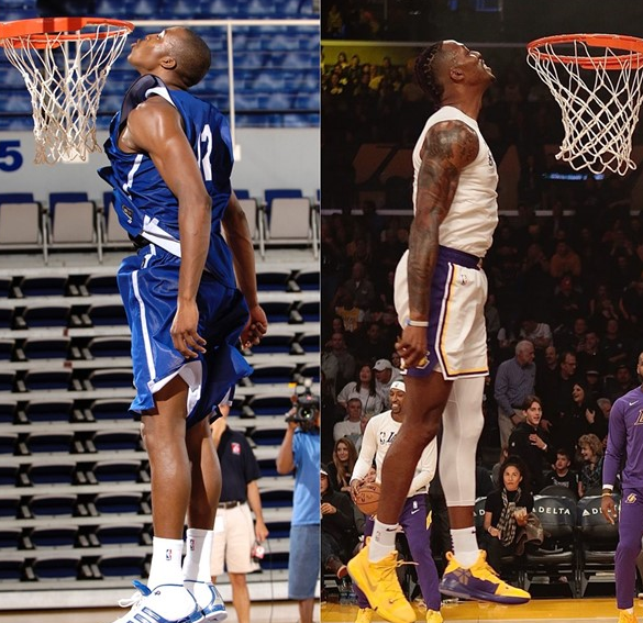 最后来看看霍华德弹跳,他曾经在一档栏目里摸高3米84,这还是当时NBA摸高纪录。反正在中锋里,他的弹跳是总统山级别。最直观欣赏他的惊人弹跳,那还是他年轻时亲吻篮筐,那一脸轻松和愉快,感觉都没怎么用力。即使现在都快35岁了,亲吻篮筐也不难,这弹跳确实可怕!