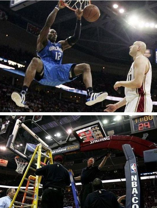 霍华德年轻时就是靠身体打球,反正他力量足,没几个能受得了他的进攻。霍华德力量不输奥尼尔,奥尼尔能把篮筐扣碎,他能把计时器扣坏。在奥尼尔之后,NBA篮筐质量就强化了很多,霍华德还能把计时器给扣坏,这力量有多大一想就明白。