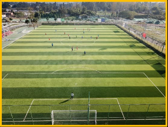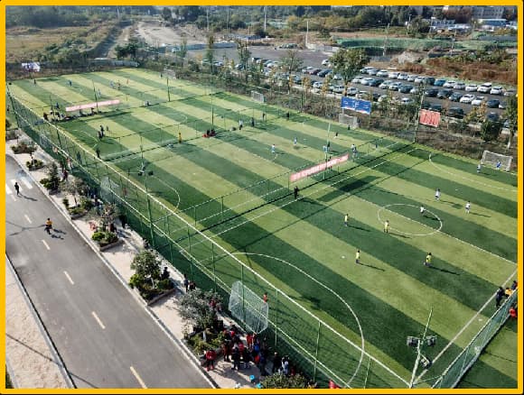 5人制球场共计5片,按照标准尺寸修建,设计了足够的缓冲区,铺设了专业的弹性垫——踢球的感觉像踩在真草上一样,大大提升了运动体验度,集中的排列形式也非常适合各项活动和比赛的举行。