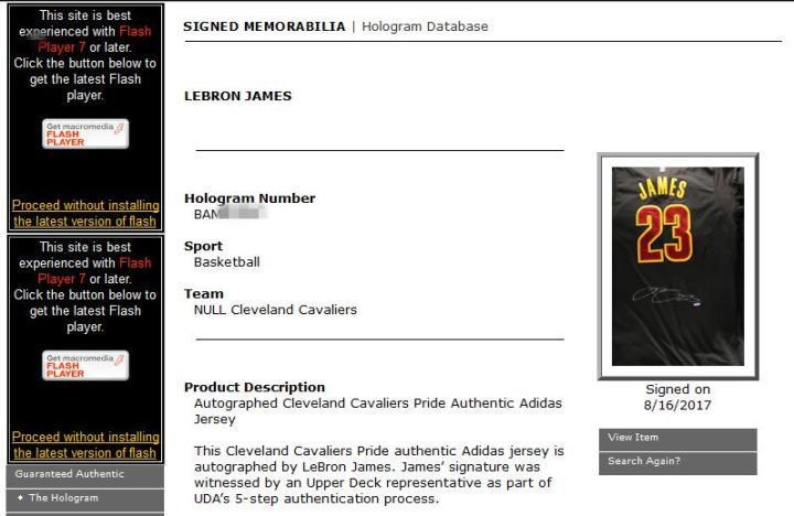 UDA自建了一个数据库,在这里主要输入球衣或证书上的编号,就能查询出认证结果。这样的设计自然比只有镭射标和纸质证书多了一层验证渠道。