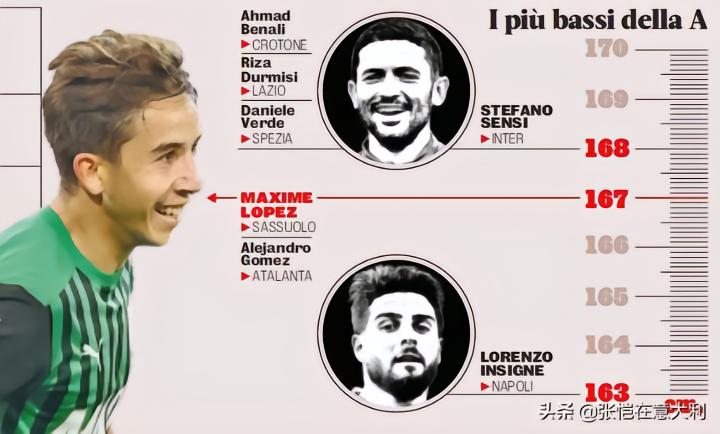 意甲最矮球员是那不勒斯的因西涅,163公分,国米的森西等人168厘米。年纪不大但已在法甲出战了113场比赛,都代表马赛。洛卡特利出自米兰青训,1200万加盟,如今身价2500万,固定意大利国脚。德泽尔比夸他:“意大利20年不遇的天才中场,米兰没留住他可惜了,是我们的福气。”