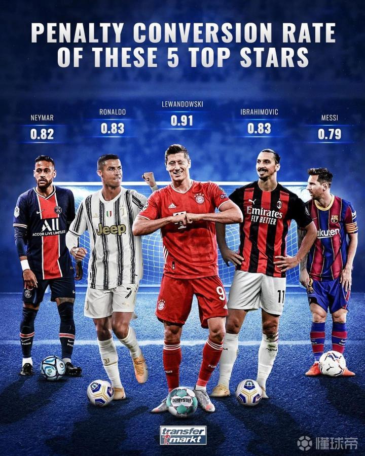 德国转会市场网站统计了莱万、梅西、C罗、内马尔和伊布等5人的点球命中率情况,莱万以91%排名榜首,C罗和伊布均以83%的点球命中率紧随其后,梅西以79%的点球命中率在5人中排名垫底。