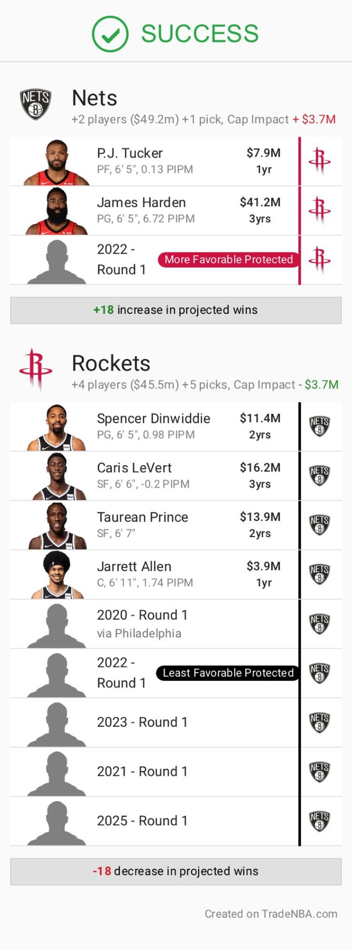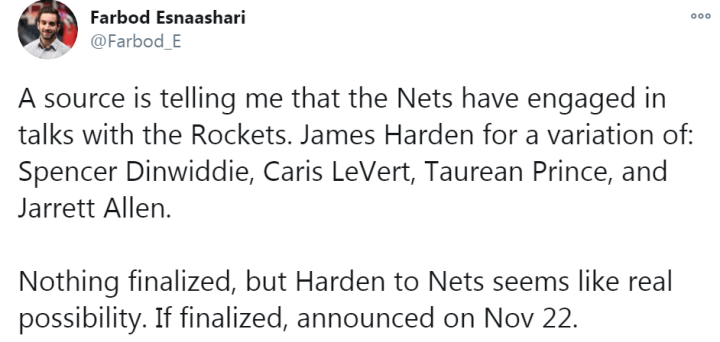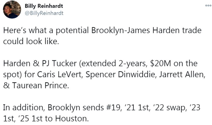 随后,篮网记者Billy Reinhardt转发了这则消息,并补充了可能的交易方案。具体方案是火箭送出哈登和塔克,得到勒维尔、丁威迪、阿伦和普林斯。与此同时,篮网还要送给火箭2020年的19号签(来自76人)、2021年、2023年和2025年的首轮签,另外,火箭还拥有2022年和篮网互换首轮的选择权。