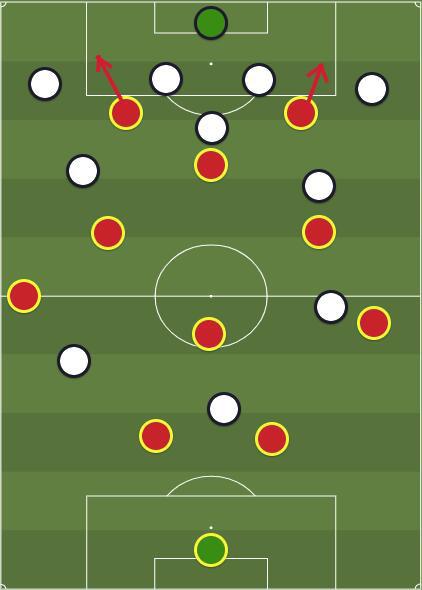 菱形中场更加具有层次感的站位让球队可以在各个区域都发动起较有威胁的进攻,无论是边后卫还是两名边前卫的拉边进攻都不会出现没有及时接应点的情况。与此同时,考虑球队在前锋线上有多达两名前锋,并且有一名位置相对灵活的前腰,前场可选择的进攻方案也更加丰富。