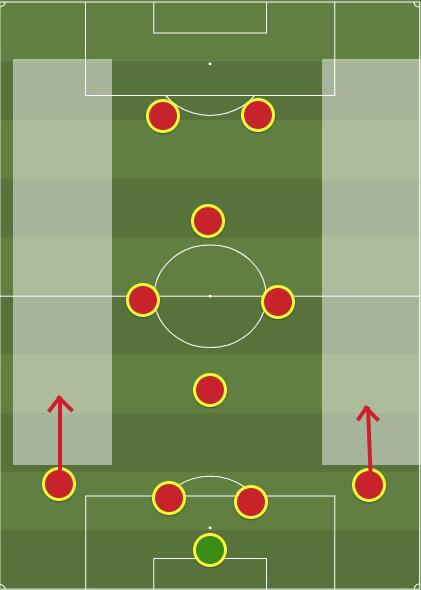 前文已经提到,由于菱形中场更多靠近在中路,而左中场、右中场又并非传统意义上的边路选手,因此这一套阵型的宽度需要大幅依赖于两名边后卫的插上。不过从另外一个角度来看,边后卫的插上毕竟只是比赛过程中的一种动态活动,一旦他们没有办法及时到位,前场进攻的阵型宽度就不得不依靠两名前锋来提供。
