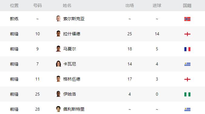 我们再来看一看曼联可选用的双前锋搭配,当下曼联阵中共有6名前锋,分别是10号拉什福德、9号马夏尔、7号卡瓦尼、11号格林伍德、25号伊哈洛以及28号佩利斯特里。其中25号伊哈洛以及28号佩利斯特里不在球队主力阵容中,因此笔者在这里不予考虑;7号卡瓦尼虽然成名已久,但来到曼联以后更多担任着替补角色,因此我们在首发阵容中也不予考虑。