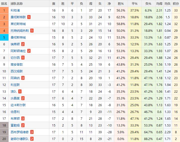 本轮比赛2:1战胜阿斯顿维拉后,红魔在16场比赛中取得了10胜3平3负的优秀成绩,与红军利物浦同积33分,仅因为净胜球的劣势屈居第二。