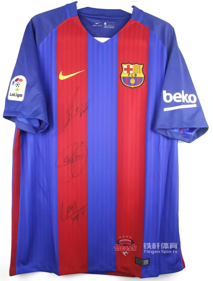 今天铁杆给大家分享的球衣是MSN联合签名的16/17赛季巴萨主场球衣,这是内马尔在巴萨的最后一个赛季。巴萨在这赛季拿到了队史第29个国王杯,欧冠上演惊天大逆转,6-5淘汰巴黎圣日耳曼。