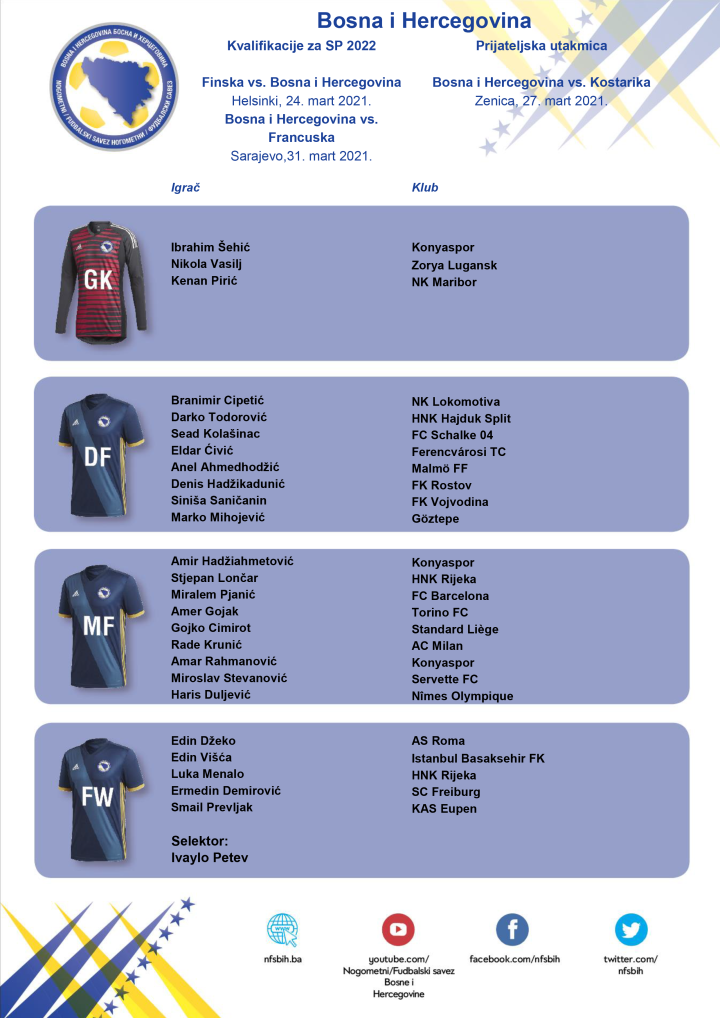 为备战3月份的比赛,波黑国家队主教练、保加利亚人彼得夫日前公布了一份25人名单,哲科、皮亚尼奇、科拉希纳茨、维斯卡、克鲁尼奇等球员悉数入选。