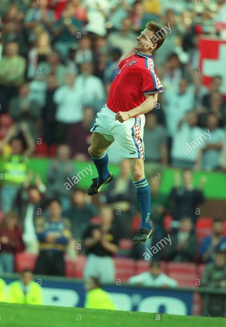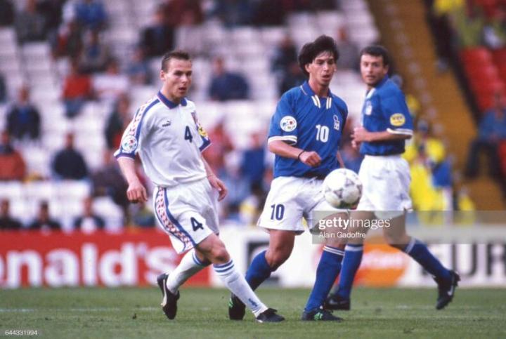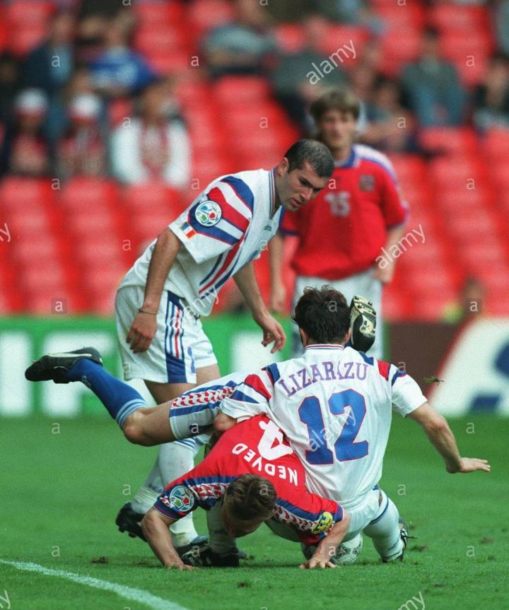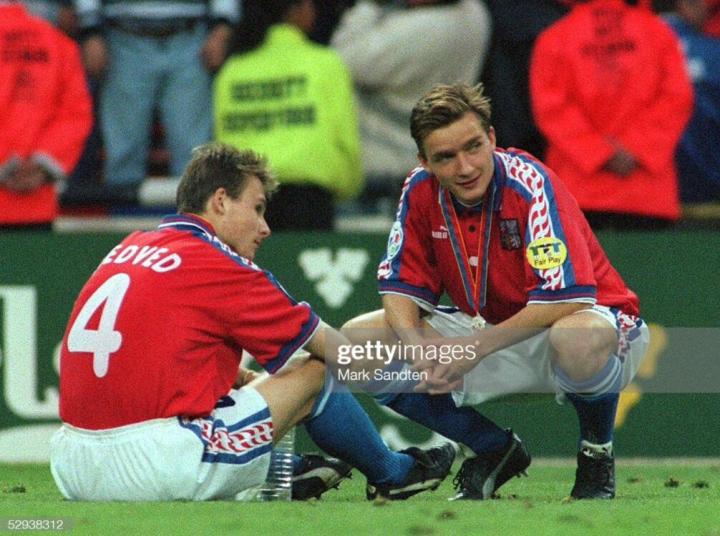 1996年欧锦赛,捷克队虽然名气不大,但也是兵强马壮,全队一身puma装备,捷克队首战面对德国,内德维德当时身披四号球衣,穿的球鞋puma的最早的king sl足球鞋。踢的位置还是右边翼卫,难免有些不适应,首场比赛0比2惨败德国,大多数人都以为捷克队无法小组出线,因为小组中还有意大利队。没想到内德维德在和意大利队的比赛中,率先发难,一次后插上偷袭得手,帮助捷克爆冷2比1击败了意大利。最终这场胜利让捷克力压意大利出线,当然他们三比三逼平俄罗斯的比赛也非常经典。