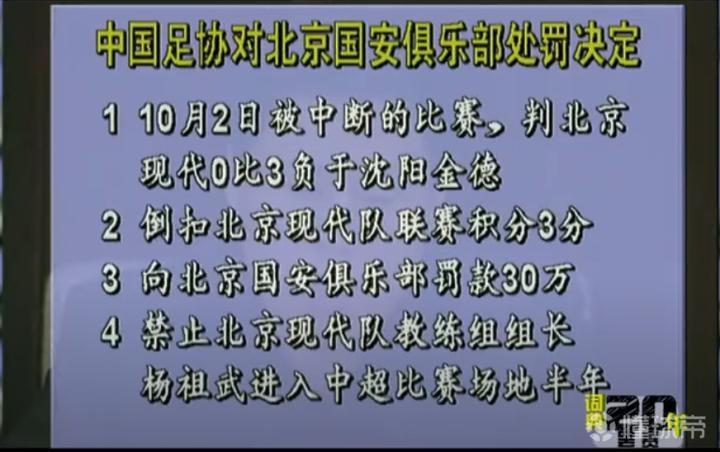 “对北京国安足球俱乐部罚款人民币30万元;判本场比赛北京现代队0:3负;扣除北京现代队2004年中超联赛积分3分。”