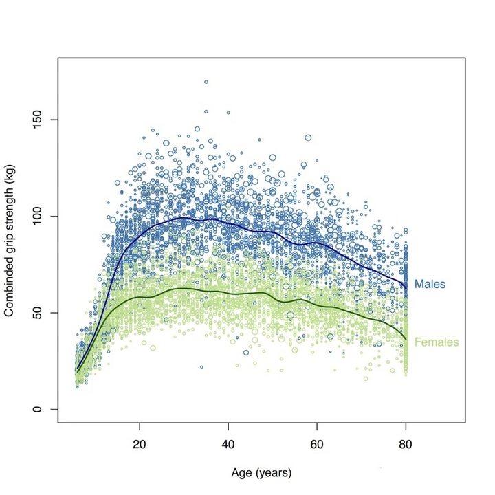蓝色是男性的力量和整体素质分布,绿色是女性,在同等年龄和体重的情况下,运动能力优秀的女性基本上可以持平中等和中等偏下的男性体力水平。