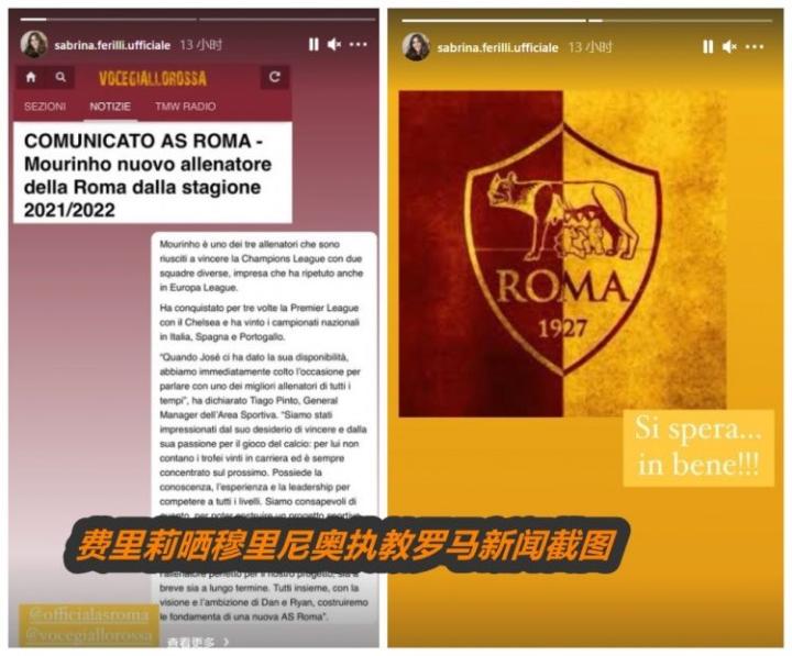 【吐槽个球】穆里尼奥执教罗马的消息引爆世界足坛,...Laoshu @懂球帝2021-05-05 17:05【吐槽个球】穆里尼奥执教罗马的消息引爆世界足坛,而“罗马教母”萨布里娜-费里莉也在INS上流露出了惊喜之情。 她晒出了鸟叔执教红狼的新闻截图,同时晒出罗马队徽图腾,写道:“不错!”展开更多