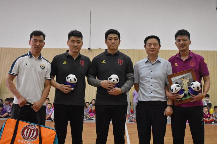 活动最后,西川实验学校小学部魏庶校长和小球员张天御与成都蓉城足球俱乐部梯队教练何杨、伊帆、肖博互赠了礼物。