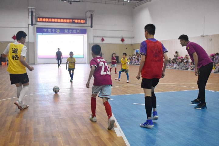 随后,何杨与肖博分别带领一队小球员进行了一场分组对抗赛。场上的小球员们挥洒汗水,场下的小朋友们齐声呐喊助威,整齐的“成都,雄起”助威声在学校体育馆内回响。