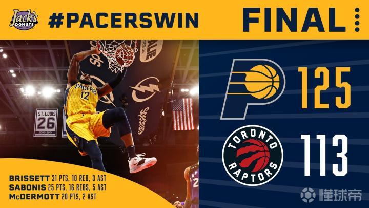 本场比赛步行者布里塞特爆发砍下生涯新高31分10个篮板,帮助步行者击败猛龙,确定东部第九。赛前,猛龙已确定无缘季后赛,主将悉数缺战。比赛首节打的非常焦灼,第二节后半段步行者小萨博尼斯和布里塞特相继发力将分差拉大到10分以上,之后猛龙再也没能追上脚步,这个分差也一直维持到比赛结束,步行者125-113战胜猛龙,确定东部第九,附加赛主场对战黄蜂。数据方面步行者这边布里塞特31分10篮板,小萨博尼斯25分16篮板5助攻;猛龙这边弗林27分5助攻,约翰逊24分5篮板7助攻。